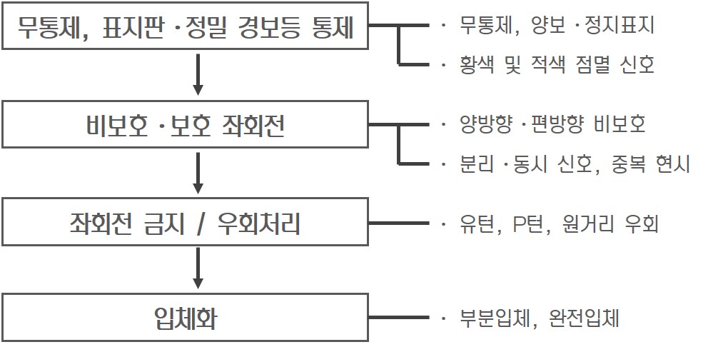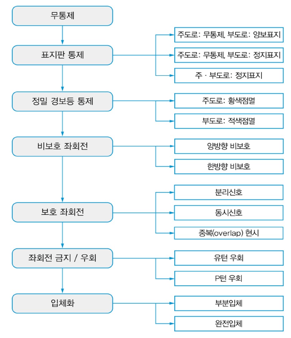 일반적으로 좌회전 교통류를 관리하는 방법은 교차로 교통량이 많아짐에 따라 신호등이 없는 비신호교차로에서부터 교차로 입체화에 이르기까지 아래 그림과 같이 진전됨