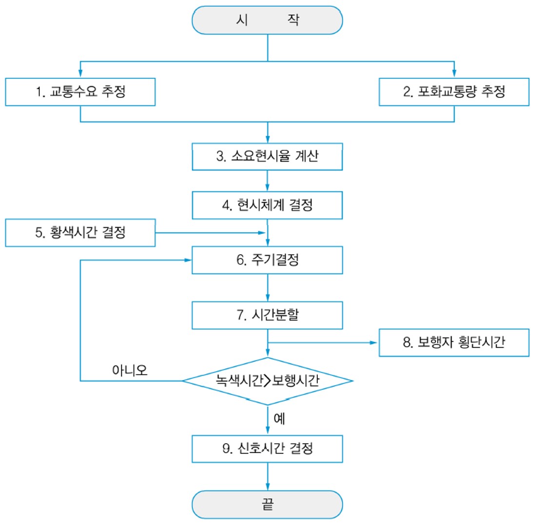 신호시간계획은 신호현시, 신호주기, 황색시간, 녹색시간 등을 결정하는 일련의 절차를 말하며, 일반적으로 신호시간계획 절차는 아래와 같음