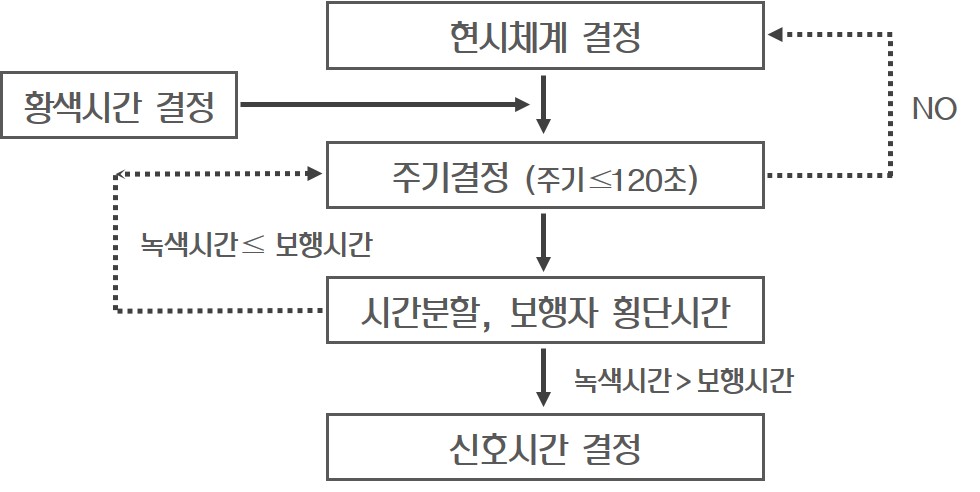- 보행자 대기시간 및 차량 대기행렬 최소화를 위한 신호주기 단축
