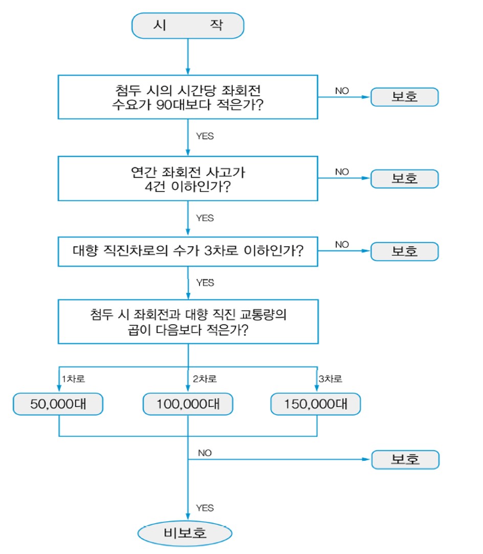 - 좌회전 교통량 90대/시 이상, 대향 직진차량과의 곱이 차로당 50,000대/시 이상