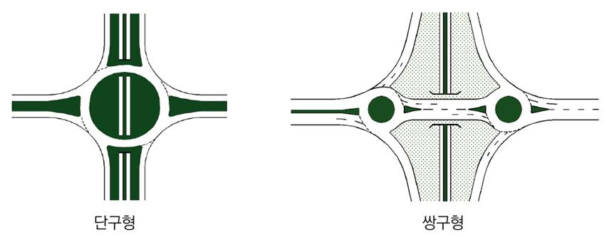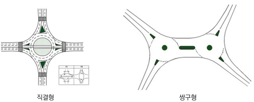 | 평면형 회전교차로 | - 기본유형 외에 평면으로 설치된 회전교차로로 직결형과 쌍구형으로 구분 - 직결형 : 특정 접근로에 용량이 과포화되어 분산처리가 바람직한 교차로, 직진 교통량이 특히 많은 교차로에 효율적 - 쌍구형: 비대칭 교차로, 네갈래 이상 교차로, 두 개의 교차로가 매우 가까운 거리에 인접한 경우 적용할 수 있음 |