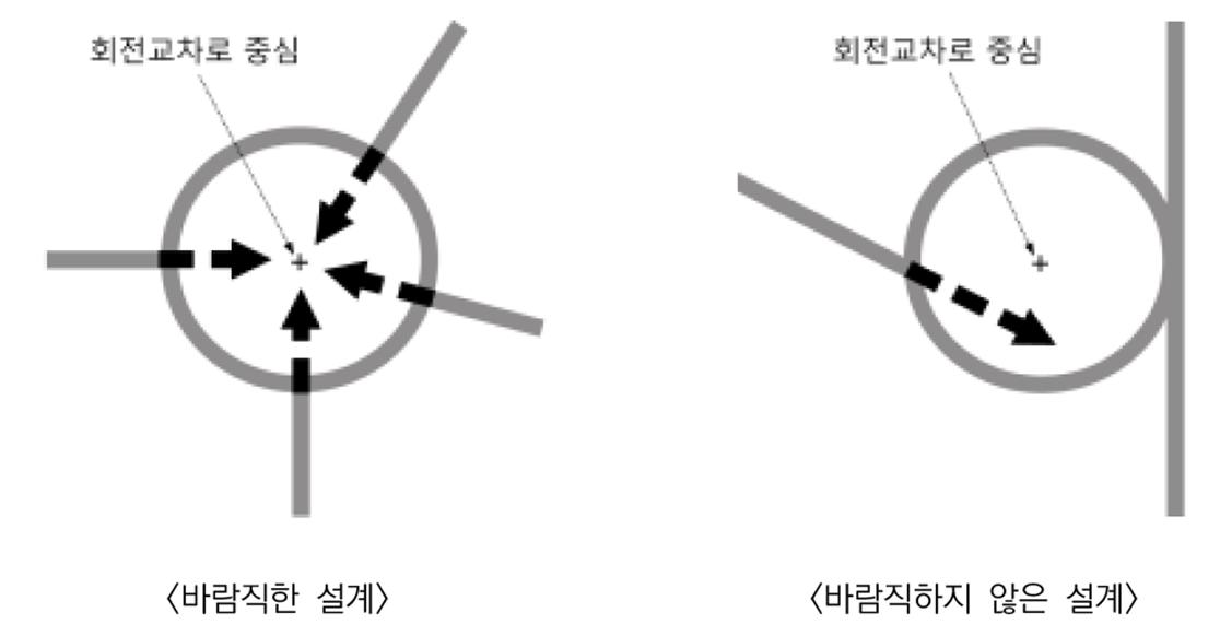 - 접근로 연장축 방향은 회전교차로 중심을 향하도록 설계 (부득이한 경우 중심의 왼편으로 설계)