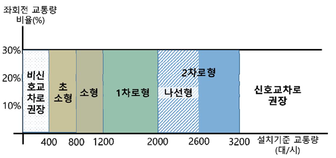 - 좌회전 교통량비율이 30%를 초과하는 경우 교통운영분석을 통해 교차로 운영방식 결정