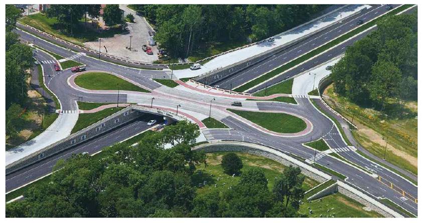 | 입체형 회전교차로 | - 간선도로와 접속되는 고속도로 연결로 압체시설에 설치, 단구형과 쌍구형으로 구분 - 용량이나 안전측면에서 다이아몬드 입체교차로의 상부 및 하부교차로의 대안이 될 수 있음 - 특히, 좌회전 교통량이 많은 연결로에 설치할 경우 진출입 자동차의 원활한 처리 가능, 주변 접근성 유리 - 물방울(Teardrop 혹은 T-Drop) 회전교차로 : 램프설치공간 및 구조물 최소화 |