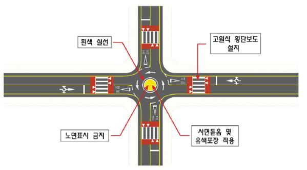| 소형 회전교차로 | - 설계기준자동차 : 소형자동차 - 회전부 설계속도 : 10~20km/h / 내접원지름 : 15.0~26.5m - 중앙교통섬 : 사면돋움 또는 연석 이용 돌출된 형태로 설치 |