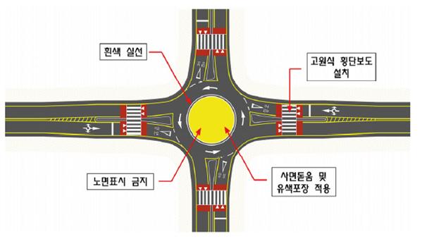 | 소형 회전교차로 | - 설계기준자동차 : 소형자동차 - 회전부 설계속도 : 10~20km/h / 내접원지름 : 15.0~26.5m - 중앙교통섬 : 사면돋움 또는 연석 이용 돌출된 형태로 설치 |